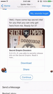 At launch, in support of Marvel Comics’ SECRET EMPIRE event, the Marvel chatbot will allow fans the ability to converse with everyone’s favorite neighborhood wall-crawler, Spider-Man! Fans will also be able to engage in fun quizzes & puzzles, receive exclusive first-looks, and find their local comic shops.