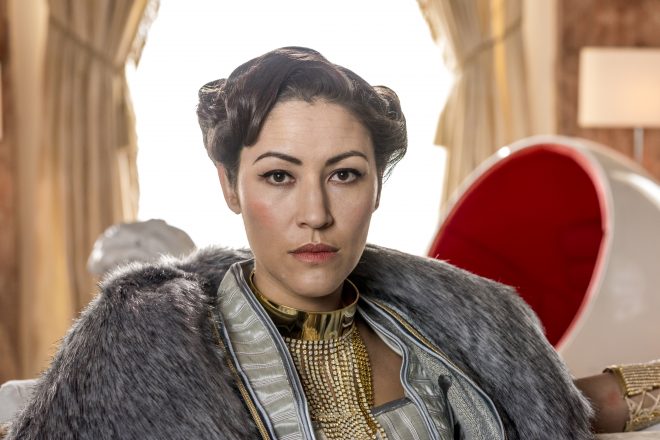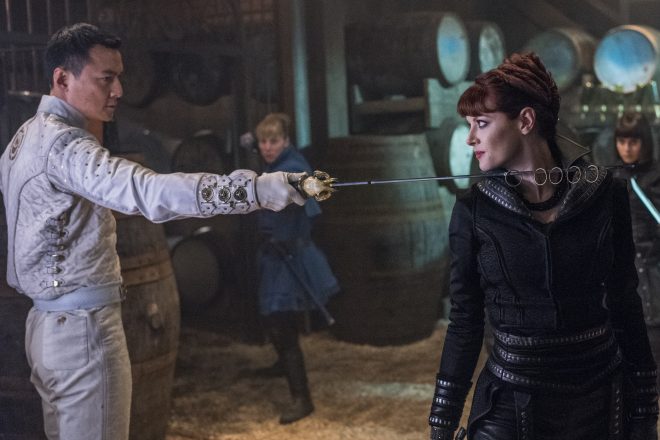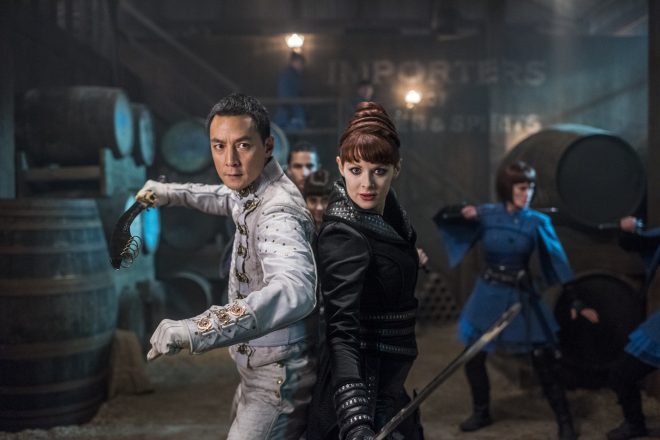 Meanwhile Bajie (Nick Frost) books passage into the Badlands for himself, Sunny, and MK (Aramis Knight) by taking a bus which is supposed to drop them off near the entry point. Enter Baron Chau’s (Eleanor Matsurra) clipper force. Sunny recognizes her men while Bajie figures out the smuggler got paid. The bus is nearly destroyed as the group is taken into captivity.