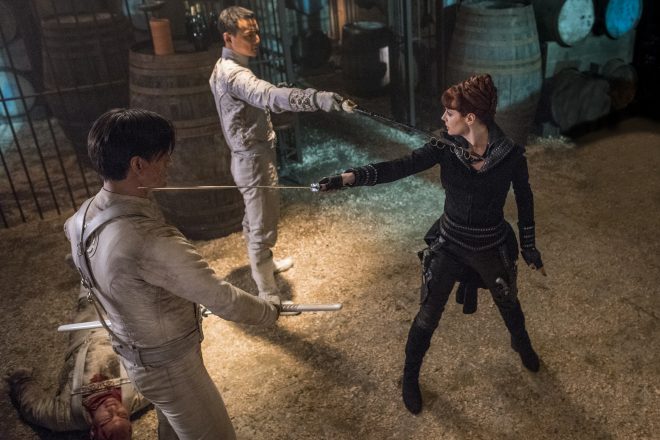 On a happier note, I was very ecstatic to see Baron Chau again! While she didn’t fight in this episode, she was rocking an outfit like she did in episode 4. She also has an awesome book collection! There were some classics on that shelf! Ms Matsurra had great chemistry with Wu. She was shrewd, confident, but pragmatic. While that alliance was short, at least Chau knew the risk she was taking. That’s why she sent a small clipper force. Even though MK didn’t bleed, I’m wondering if she will now look for a boy with powers the Widow is looking for? It would tip the balance in her favor when Quinn and the Widow come for her.